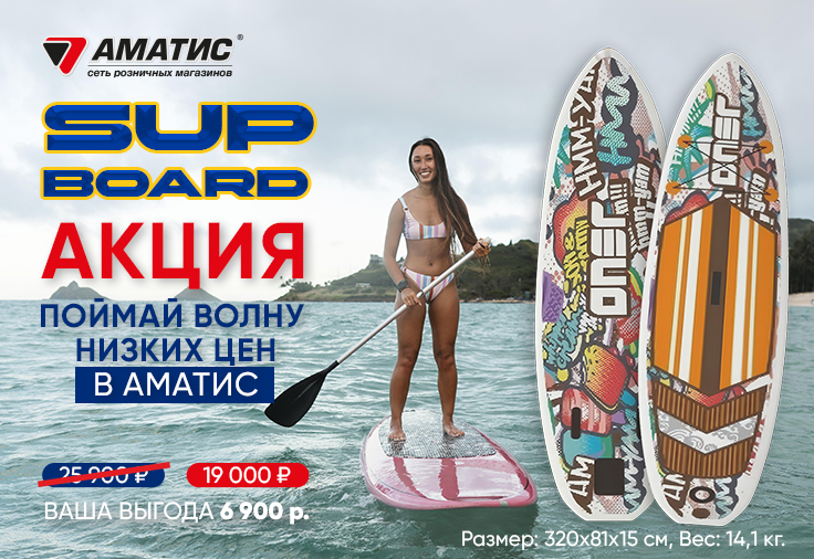 Сейчас в магазине Аматис и нашем интернет магазине действует выгодная акция на качественные сапборды: отличная модель, оснащенная всеми нужными функциями и материалами премиум-класса предлагается всего за 19 000 рублей вместо 25 900 рублей!