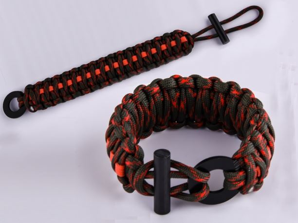 Браслет сплетён из верёвки цвета красный камуфляж, по центру оранжевая линия, схема плетения - королевская кобра, черный скребок.
