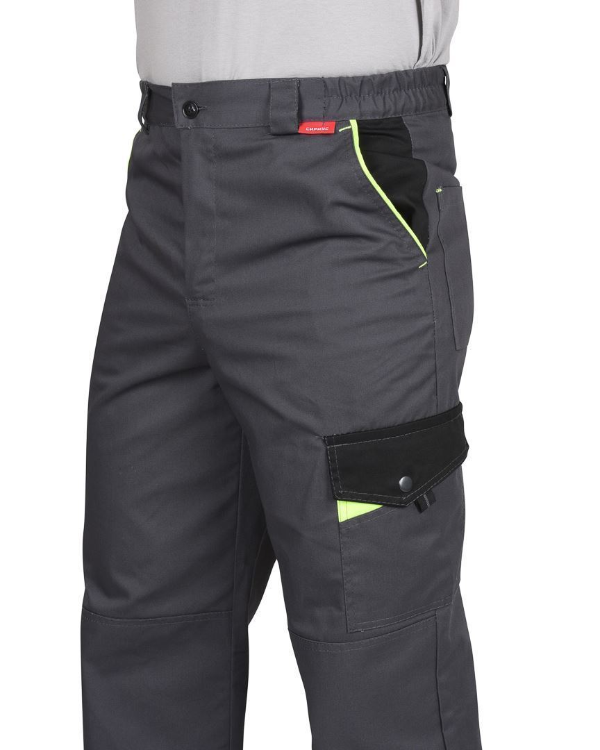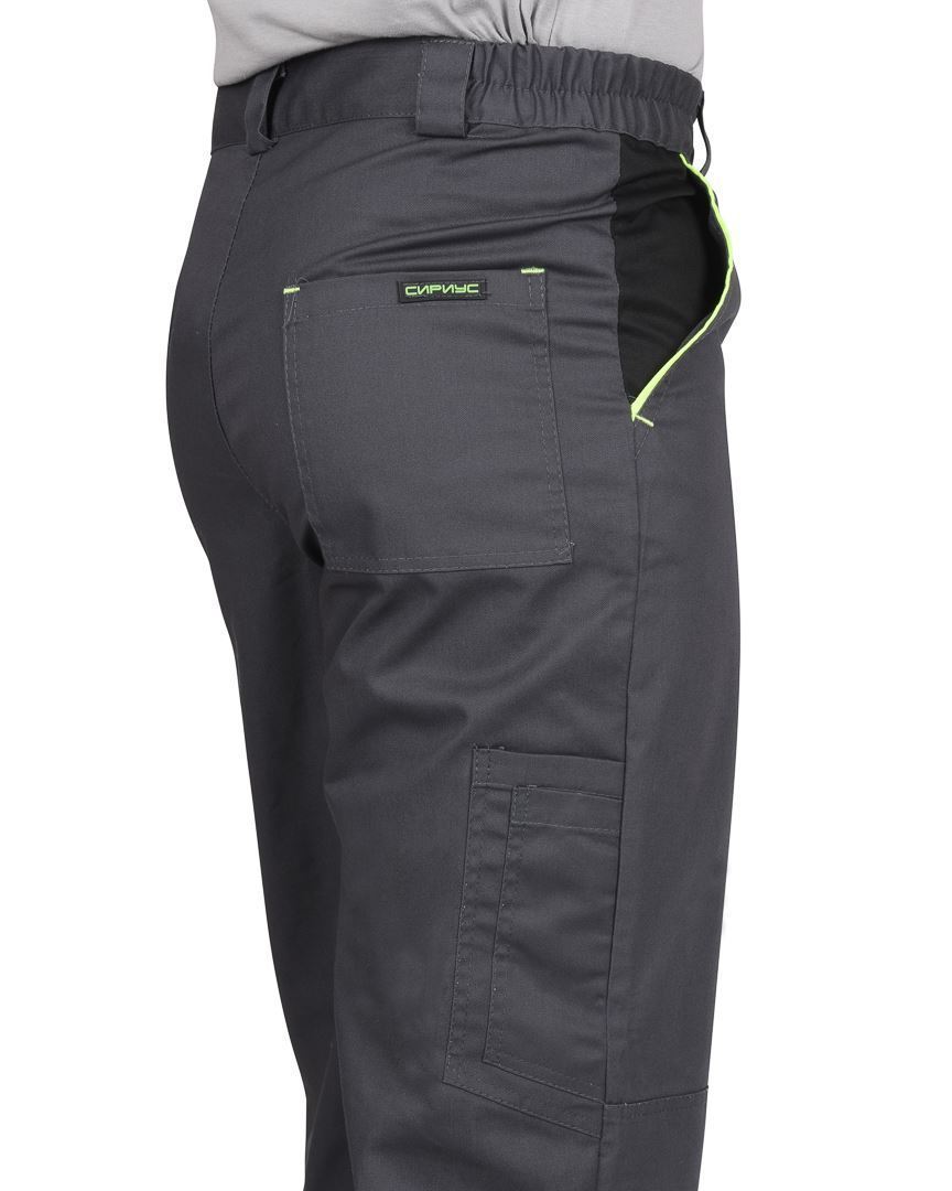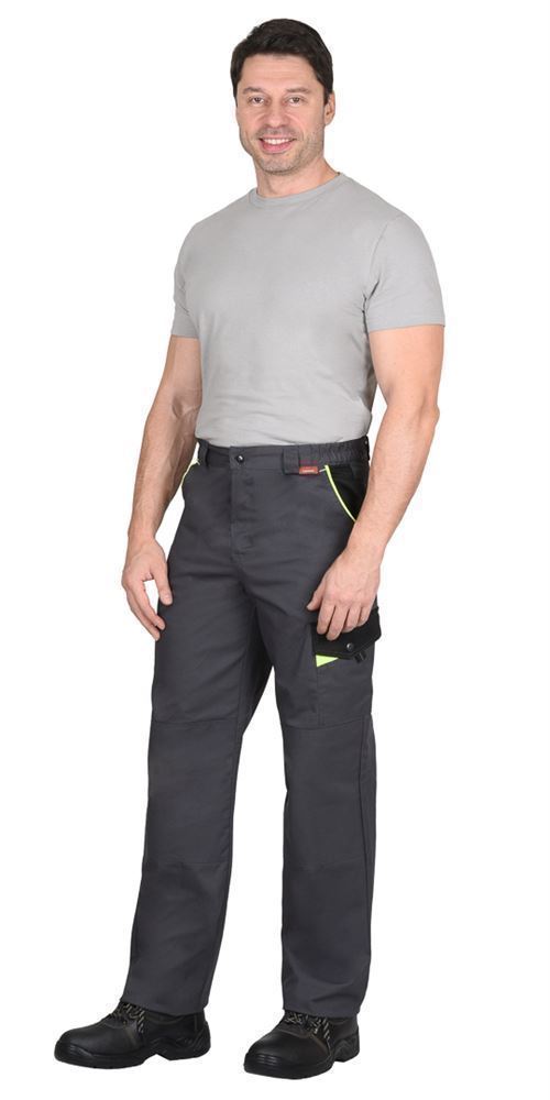 Брюки прямые, с заст.жкой спереди на тесьму «молния», с притачным поясом, с частичной стяжкой по бокам и заст.гивающимся на 1 петлю и 1пуговицу, с 5 шлевками, с внутренними боковыми карманами и наколенниками, с накладным карманом на левом боковом шве с клапаном с патой на кнопке, с двумя задними накладными карманами и карманами для инструментов.