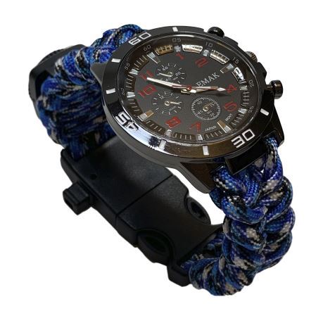 Тактические наручные часы для выживания в экстремальных условиях оснащены всеми необходимыми аксессуарами для туристов. Паракордовый браслет и надёжный пластиковый замок позволят крепко зафиксировать изделие на запястье. Паракорд используется при создании парашютных строп, так что можно не сомневаться в его прочности. Стильный сине-бело-чёрный цвет будет прекрасно смотреться не только в дикой природе, но и в повседневной жизни. Противоударный корпус из металлического сплава защитит чувствительные внутренние механизмы от негативного воздействия. На стрелки специально нанесён фосфор, так что время можно будет увидеть даже в полной темноте.