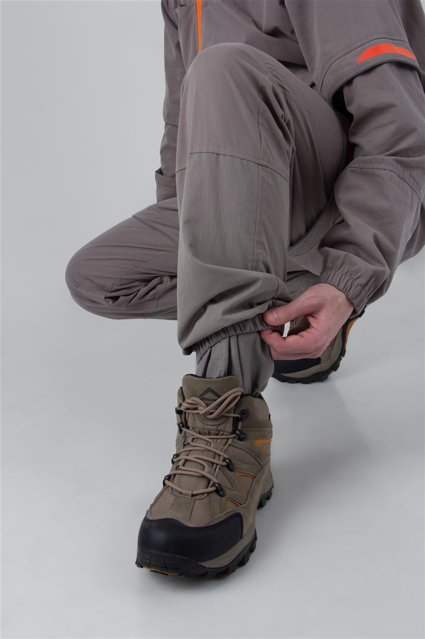 Брюки также отличаются продуманным дизайном. Эластичный пояс с шлевками и внутренней утяжкой на шнурке гарантирует идеальную посадку. Колени брюк усилены для дополнительной прочности. Низ брюк собран на резинку, что обеспечивает дополнительный комфорт во время движения. Два боковых кармана без застежки дополняют функциональность модели. Внутренние манжеты на штрипках позволяют заправлять брюки в ботинки для максимальной защиты.