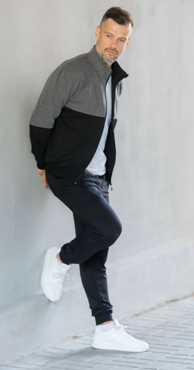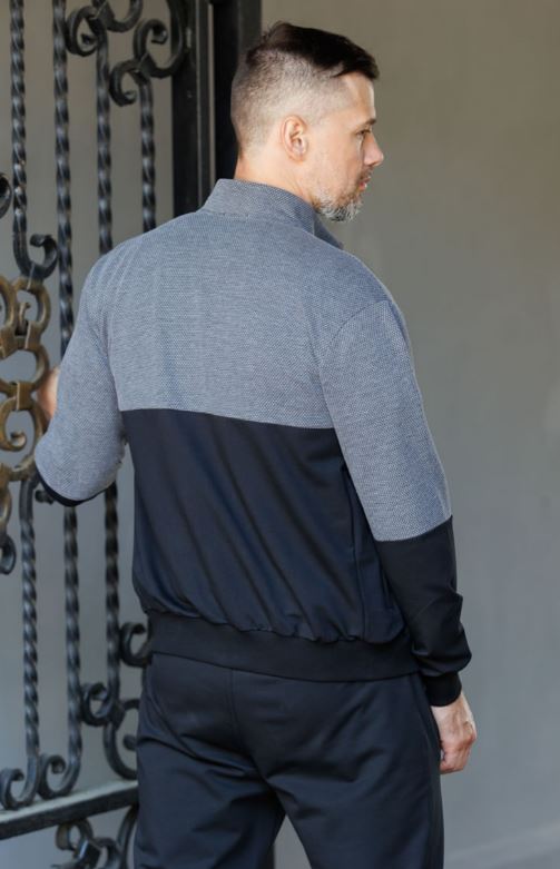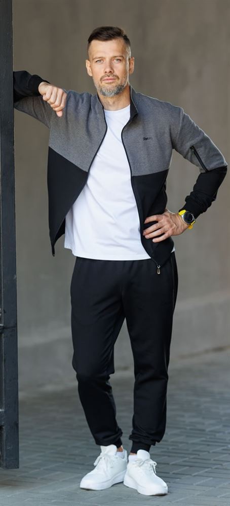Мужской костюм в спортивном стиле. Подходит для отдыха, туризма. Прорезные карманы на молнии; - Воротник-стойка; - Брюки на манжете