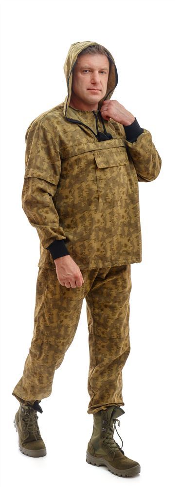 Противоэнцефалитный костюм предназначен для защиты от вредных биологических факторов (насекомых: клещей, комаров) при нахождении на открытом воздухе. В костюме предусмотрены складки-ловушки для насекомых на спинке, полочке и рукавах, а также на нижней части брюк. Изготовлен смесовой ткани. По лицевому вырезу капюшона съемная вставка из противомоскитной сетки на молнии.