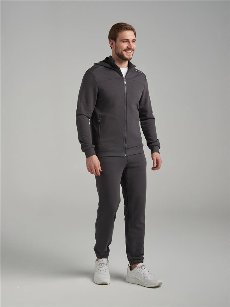 Цветовая палитра костюма состоит из графитового оттенка, который является универсальным и подходит практически к любому гардеробу.