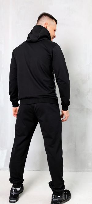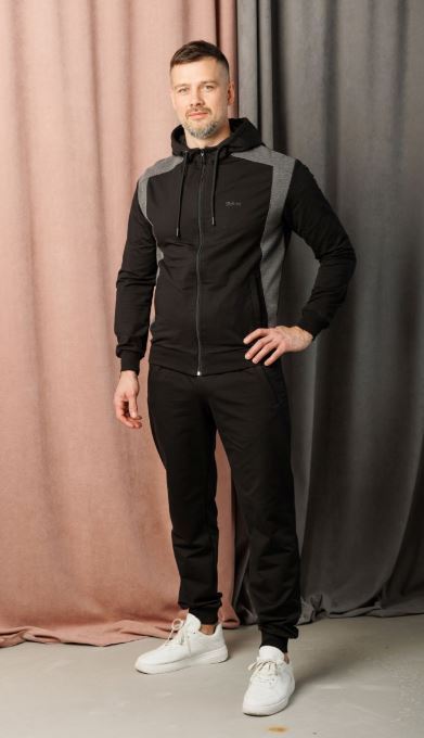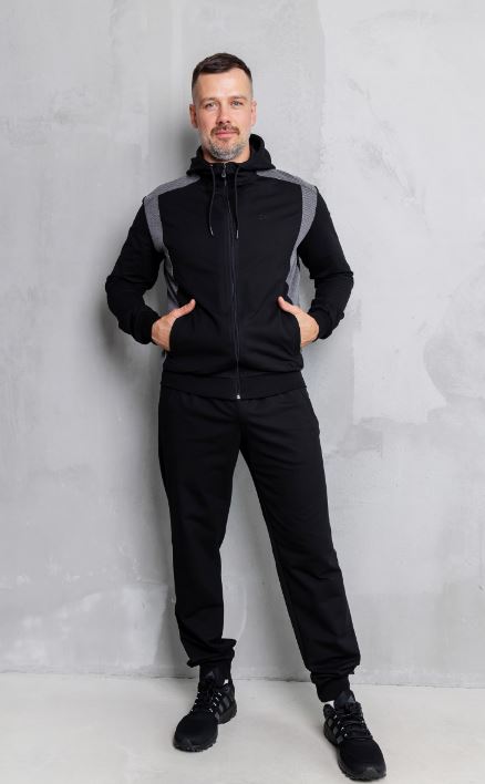 Верх - толстовка на молнии с капюшоном отличается интересным сочетанием фактур: основная часть изделия выполнена из гладкого полотна, а боковые вставки и участки на плечах — из ткани с более выраженной рельефной структурой. Это визуально подчёркивает линии корпуса и придаёт костюму выразительность. Боковые карманы на молнии. Рукава и низ изделия оформлены манжетами, обеспечивающими комфортную посадку.