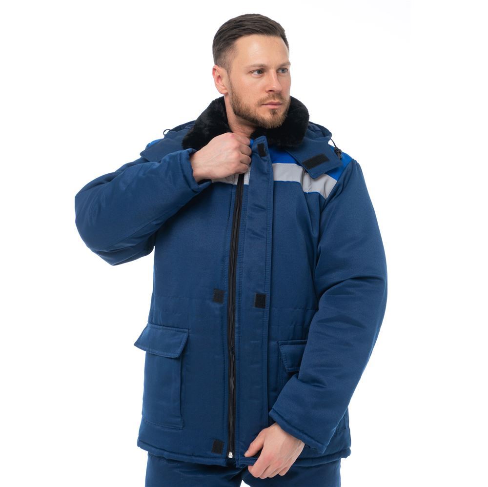 Ширина изделия регулируется по талии куртки. Изделие оснащено утепленным съемным капюшоном и меховым воротником. Центральная застежка утепленного полукомбинезона - молния.