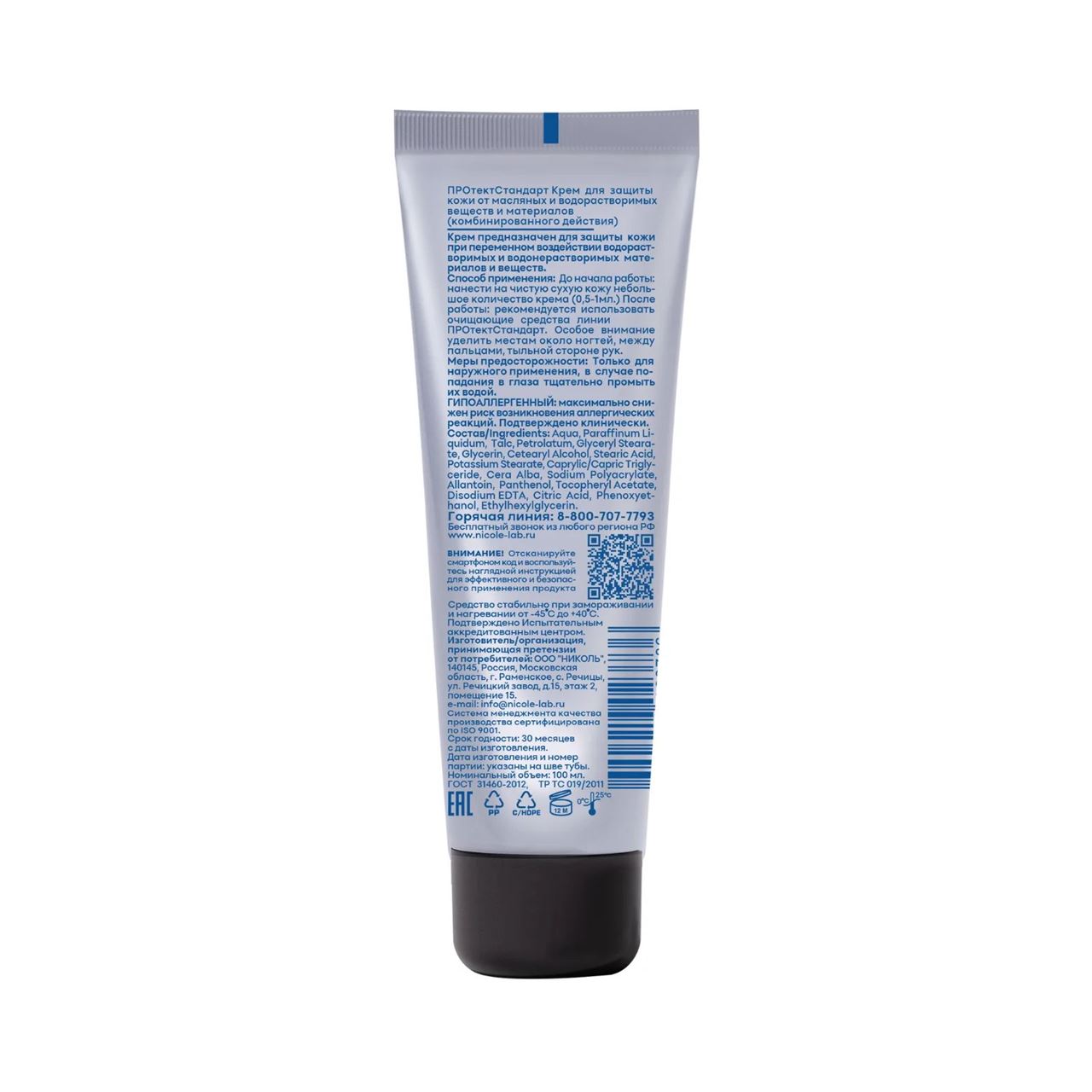 Крем для защиты кожи комбинированного действия гипоаллергенный, подтверждено клинически. Не содержит силиконов, парабенов, красителей. Средство стабильно при замораживании и нагревании от -45 С⁰ до +40 С⁰. Подтверждено Испытательным аккредитованным центром. Первая категория эффективности.