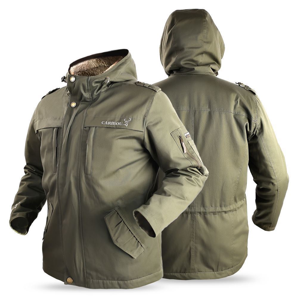 Куртка Caribou D303 Oliva, удлиненная, до линии бедер, с центральной застежкой на молнию, пластроном под замок и пластроном на 5 металлических кнопок. Капюшон регулируется по лицевому вырезу шнуром и фиксатором. На переде куртки: два нагрудных прорезных кармана с застёжкой на молнию, и два нижних кармана с клапанами. На подкладке с левой стороны прорезной карман, а с правой стороны накладной карман. Оба карманы на «молнии».