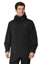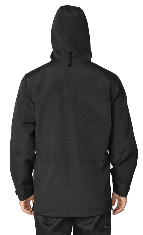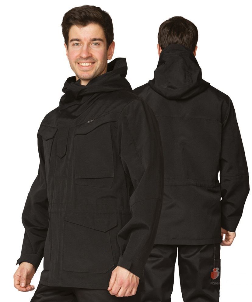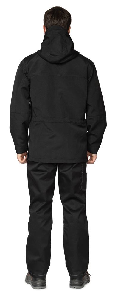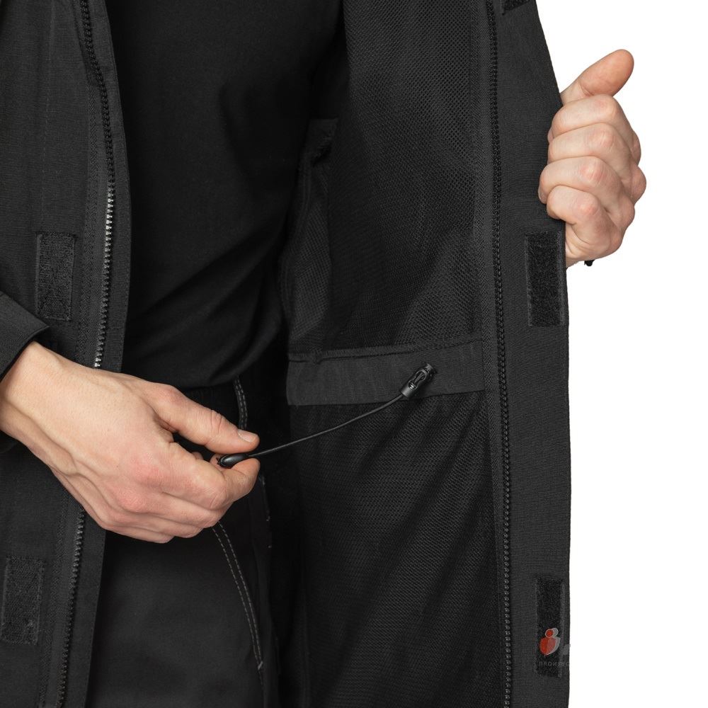 Куртка: удлинённая, прямого силуэта, эргономичного кроя, с капюшоном, с центральной застёжкой на молнию на подкладке из трикотажной сетки. Ветрозащитная планка на центральной застёжке обеспечит максимальную защиту от ветра и дождя. На ветрозащитной планке расположен клапан на контактной ленте, который предназначен для фиксации плечевого ремня сумки или нагрудной стяжки рюкзака. Рукава втачные анатомического кроя. Для регулирования объёма рукава по низу притачана фигурная пата, застёгивающаяся на контактную ленту. Нижняя часть куртки в боковых швах застёгивается на молнию для удобства при движении. Молния закрывается фигурной планкой, которая внизу застёгивается на контактную ленту. Объём куртки регулируется при помощи эластичного шнура с фиксаторами и наконечниками.