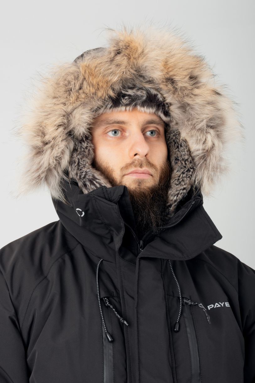 Опушка из меха енота, легко открепляться от капюшона, благодаря кнопкам. Капюшон регулируется по высоте «скрытыми» фиксаторами, по объёму фиксатор закрыт планкой. Рукава снизу регулируются патами. Манжеты рукавов сделаны из трикотаж-лайкра.