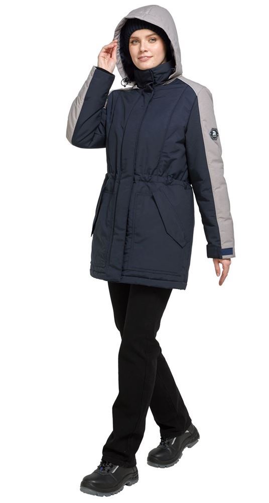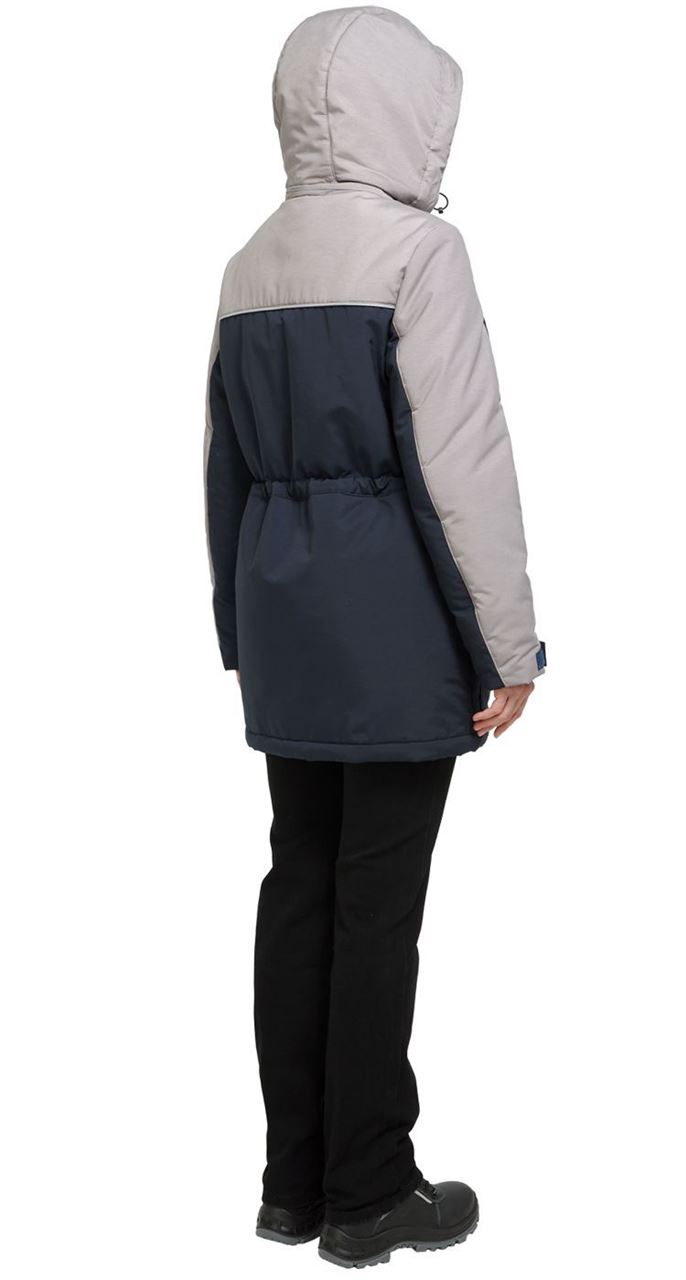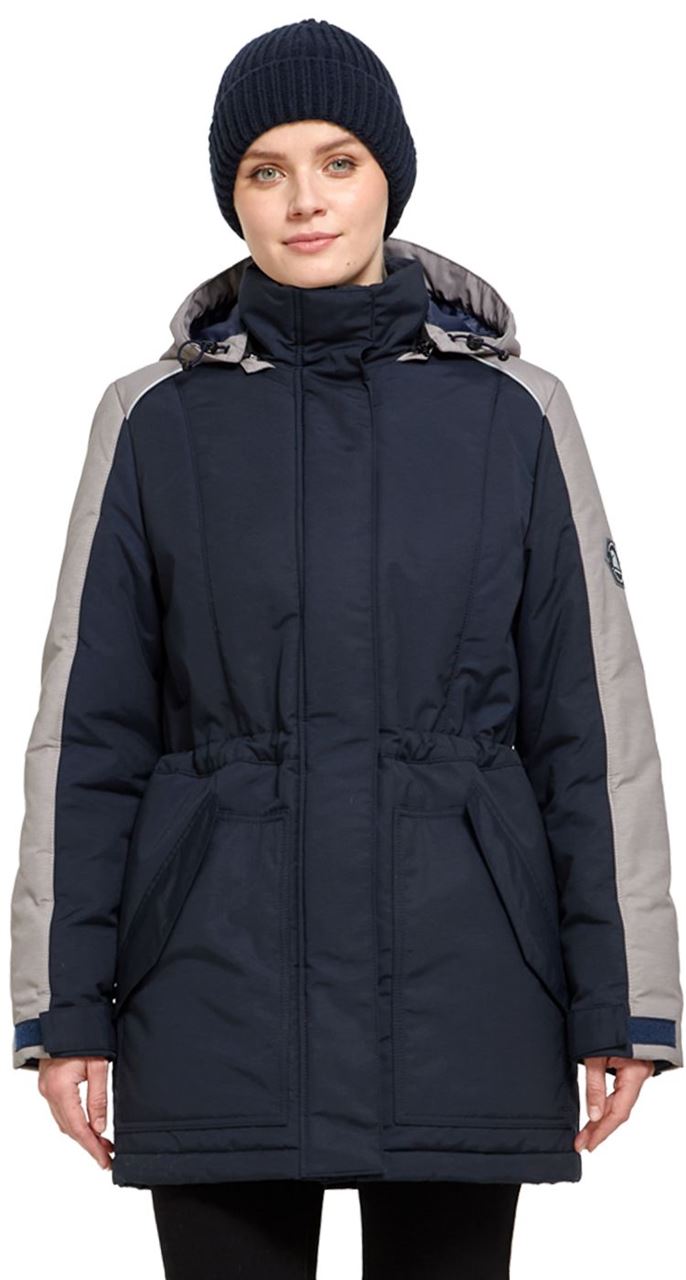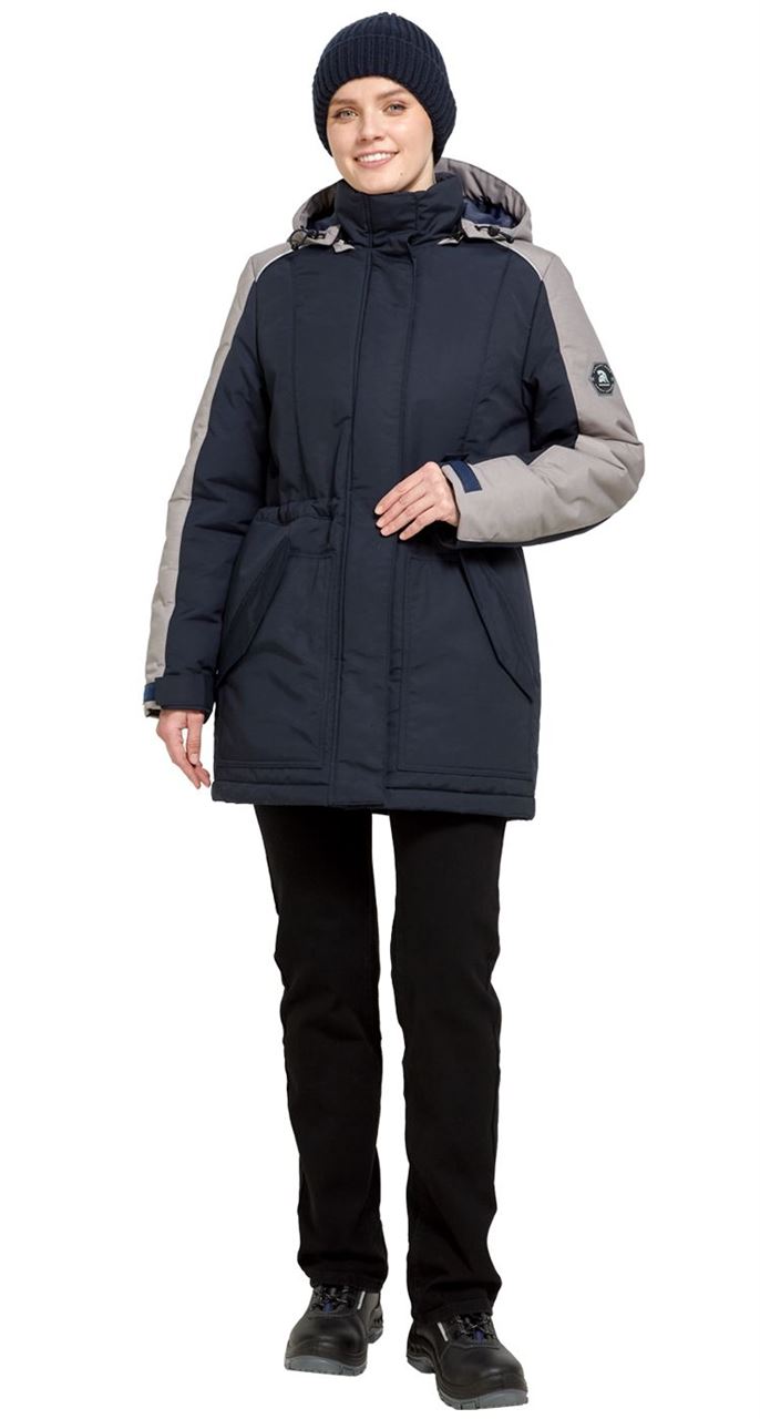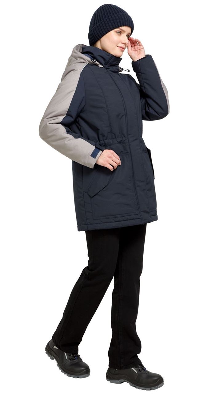 Куртка женская утепленная, удлиненная, прямого силуэта, с центральной застежкой на молнию под ветрозащитной планкой на потайных кнопках.