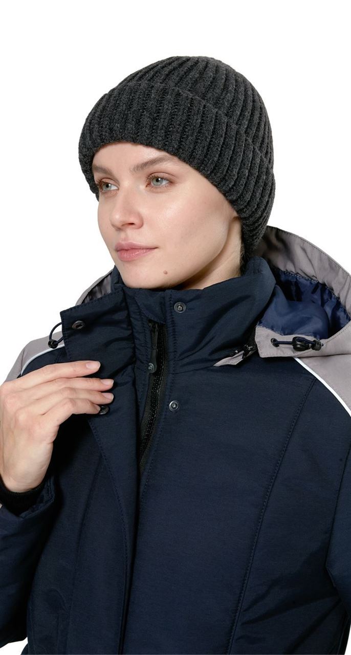 Капюшон в женской рабочей куртке съемный на молнии, с цельным козырьком, с регулировкой объема по лицевой части эластичной кулисой.