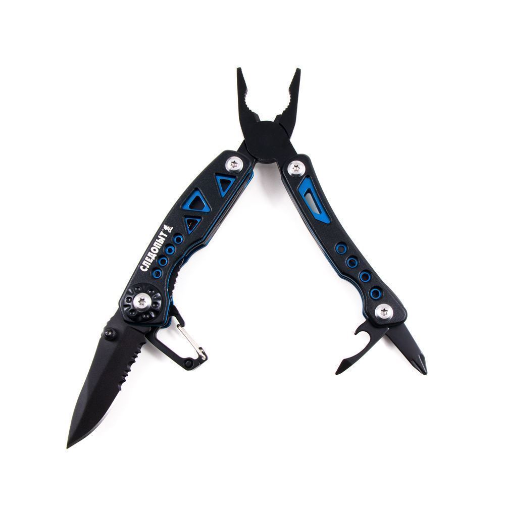 Включает в себя 11 предметов: тонконосые плоскогубцы, плоскогубцы, резак для проволоки, нож с серрейтором, карабин, открывашка для бутылок и плоская отвертка, крестовая отвертка.