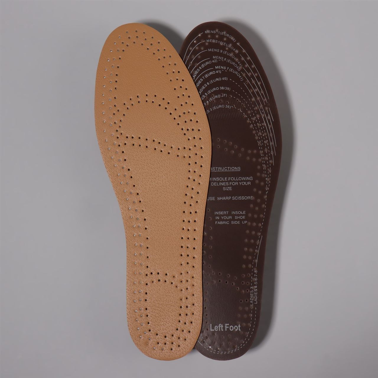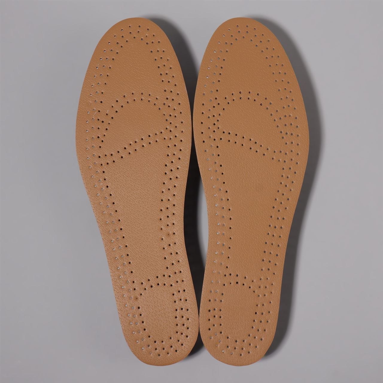 Кожаные стельки подходят для демисезонной обуви. Перфорированный материал позволяет воздуху свободно циркулировать внутри ботинок. Искусственная кожа впитывает лишнюю влагу, нейтрализует неприятные запахи и дарит комфорт при ходьбе.
