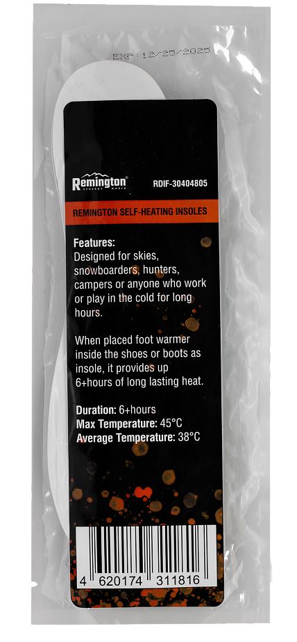 Стельки самонагревающиеся Remington предназначены для лыжников, сноубордистов, охотников, отдыхающих или тех, кто работает или играет на холоде в течение долгих часов. Если поместить грелку для ног внутрь обуви или ботинок в качестве стельки, она обеспечивает длительное тепло до 6+ часов. Максимальная температура: 45℃, средняя температура: 38℃. Срок годности стелек самонагревающихся Remington составляет 3 года.