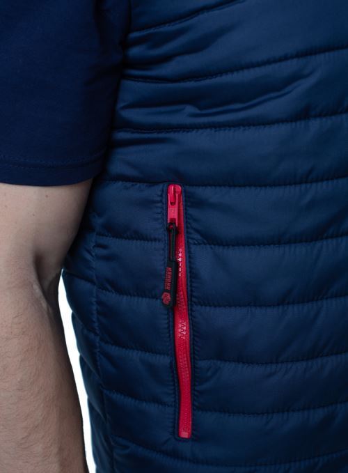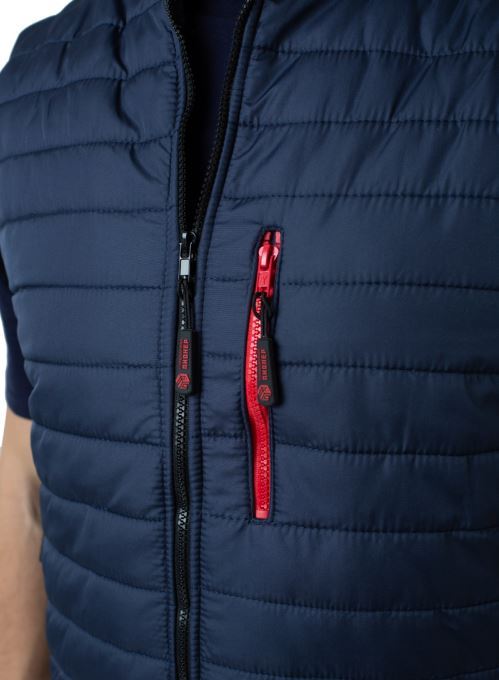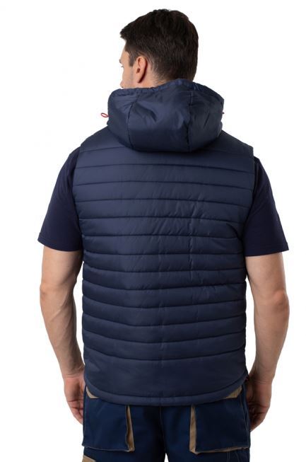 Жилет прямого силуэта на подкладке, выстеган с утеплителем, с центральной застежкой на тесьму-«молнию», прорезным карманом с молнией, капюшоном , регулировкой по низу изделия и капюшону. Наличие внутреннего кармана.