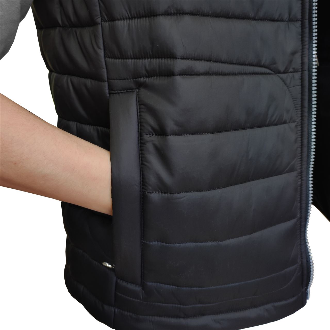В жилете арт. J-01 воротник-стойка, окантовка проймы сделана из вязаной эластичной резинки.